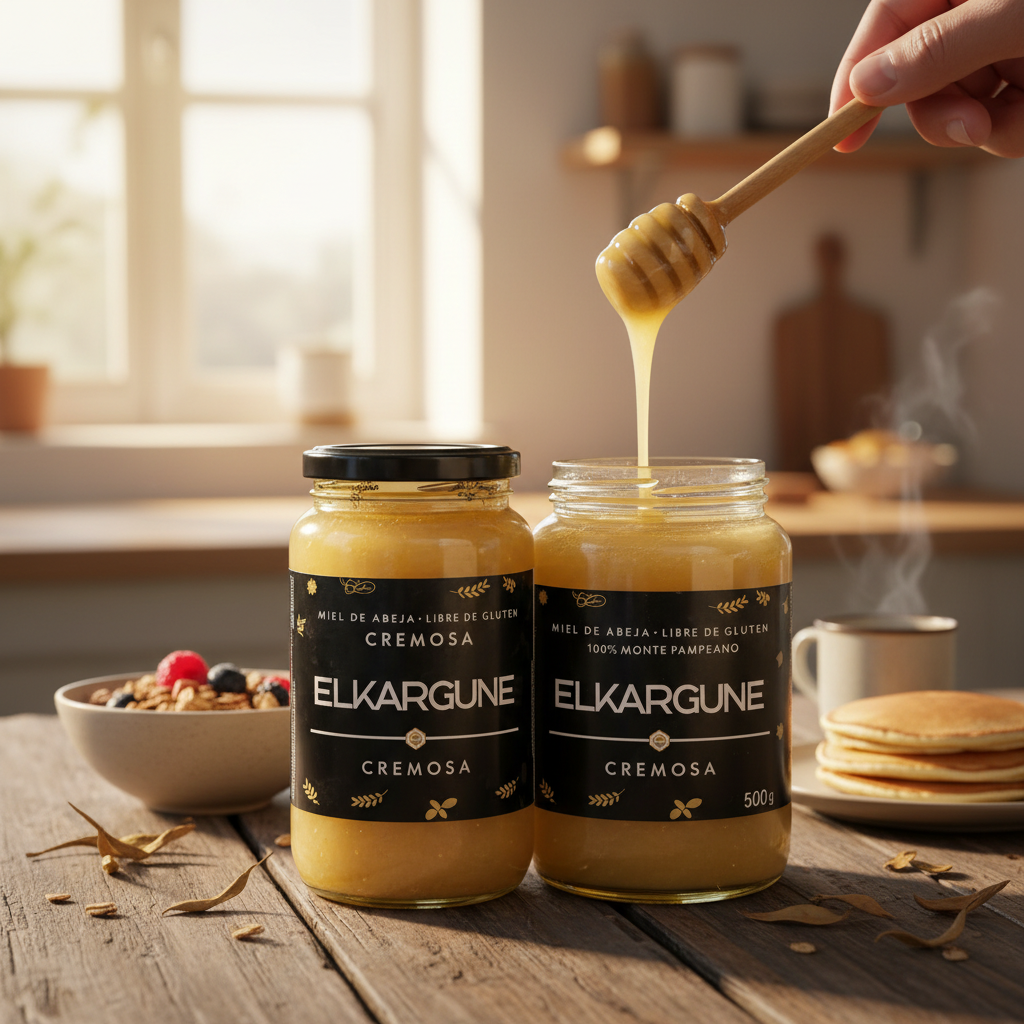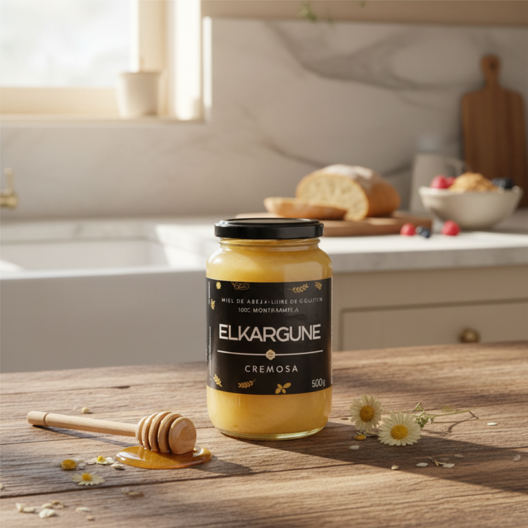 La miel cremosa ELKARGUNE, de tono claro y textura suave y untuosa, combina un dulzor moderado con un cálido aroma frutal y delicadas notas de pasto seco.